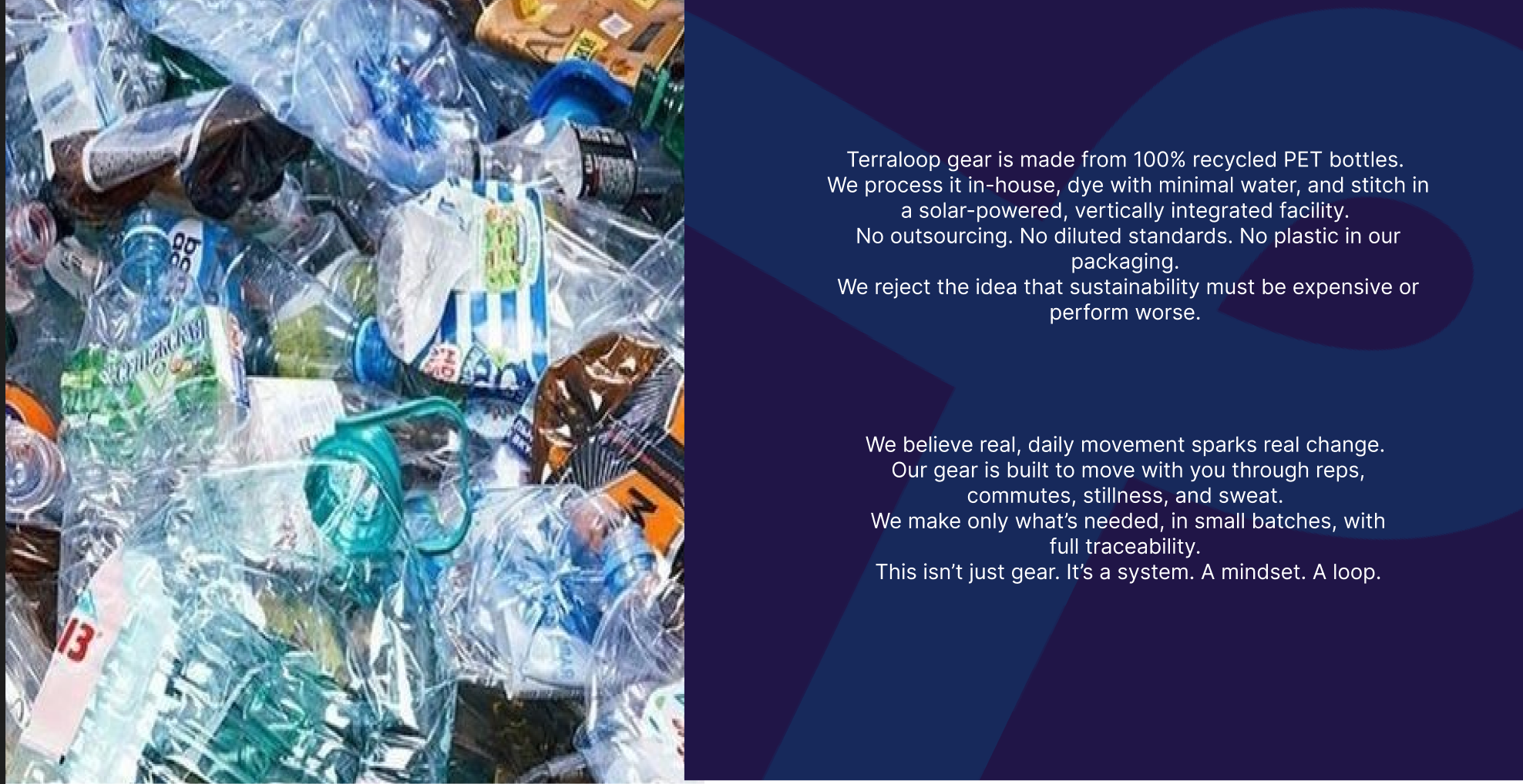 Athleisure is everywhere but most of it cuts corners with cheap fabric, vague sustainability, and fleeting trends. Terraloop was born to change that. We turn plastic waste into high-performance gear made for real life, not runway showrooms. Because doing the right thing shouldn’t cost more or compromise on function.